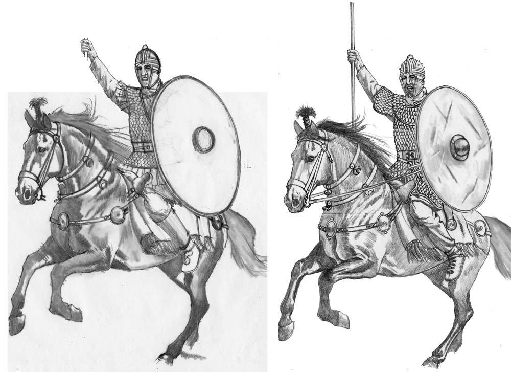 You may recognize this Roman cavalryman from the color illustration titled, “Army of Diocletian”…I usually development my drawings in about 2 or 3 stages….Note how the first sketch is to established basic form and proportions (the shield is to big!)….The sketch, on the right, is now more detailed in armor and other details…